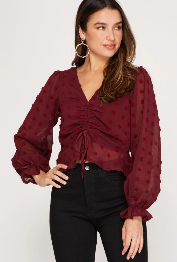 LONG SLEEVE FRONT DRAWSTRING POMPOM WOVEN TOP