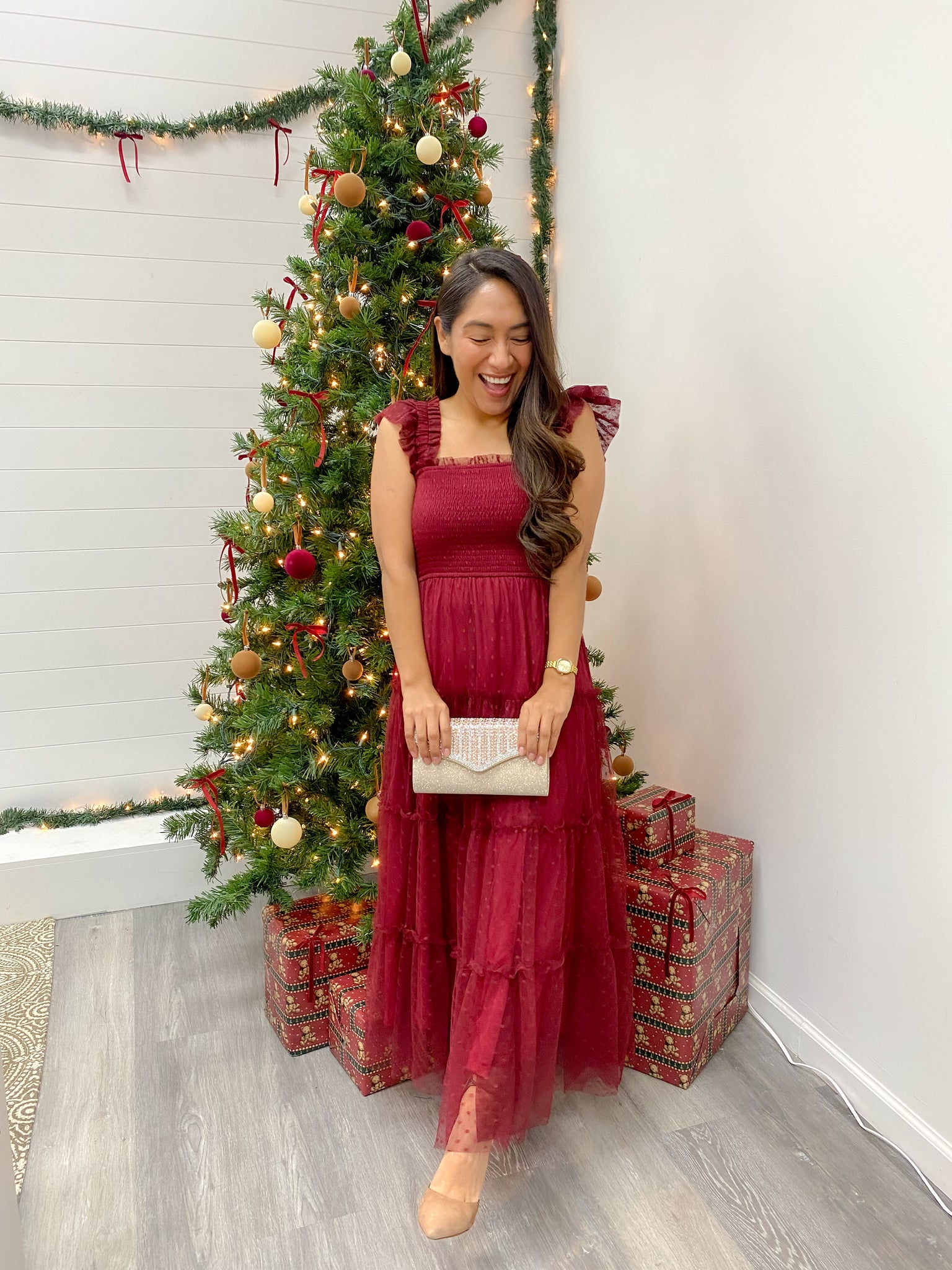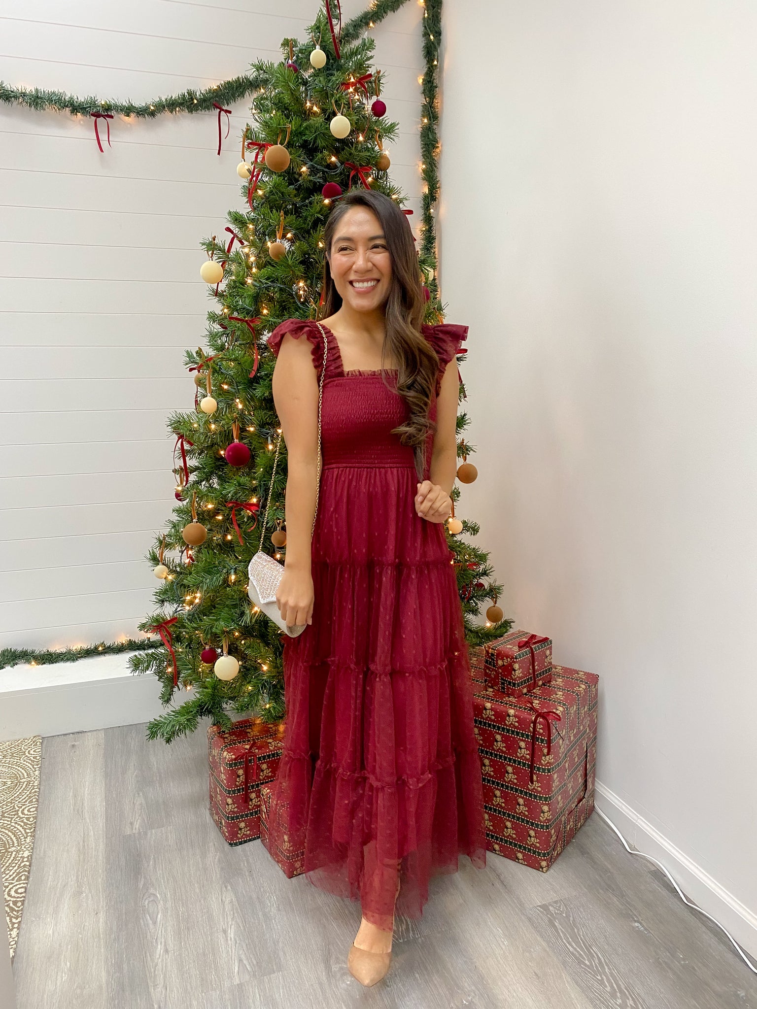 POLKA DOT CHIFFON SMOCKED TIERED MIDI DRESS